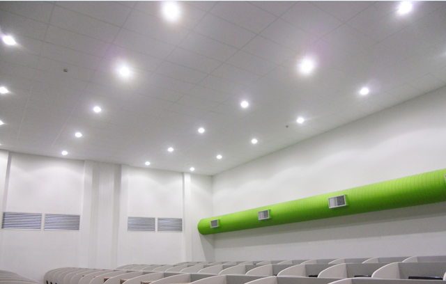 O Forro acartonado FGE é constituído por painéis de gesso acartonado Gypsum, aparafusados em perfilados metálicos e suspensos por pendurais reguladores, ideal para vencer grandes vãos com grande número de aberturas para luminárias, pode também ser utilizado como isolante acústico, tendo para isso a duplicação das placas e/ou adicionamento de lã de vidro.